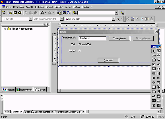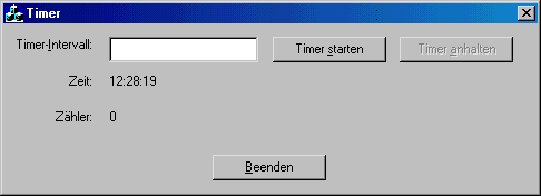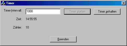 In der heutigen Beispielanwendung kommen zwei Timer zum Einsatz. Der erste Timer verwaltet eine Uhr im Fenster. Dieser Timer läuft immer, solange die Anwendung läuft. Der zweite Timer läßt sich über das Dialogfeld vom Benutzer für beliebige Intervalle konfigurieren. Der Benutzer kann den Timer je nach Bedarf starten und stoppen. Gehen wir also an die Arbeit.