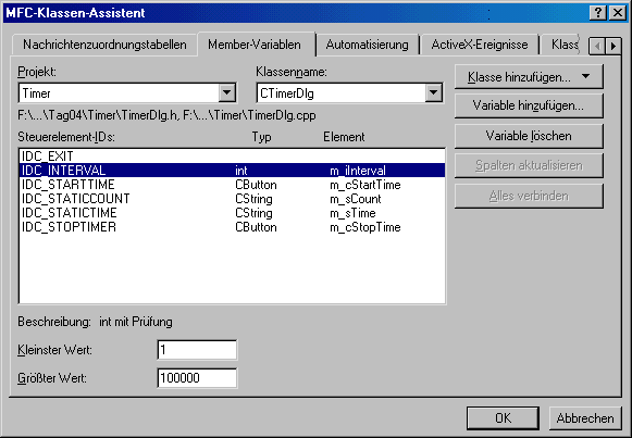 1. Nehmen Sie mit Hilfe des Klassen-Assistenten eine Variable für das Steuerelement