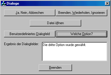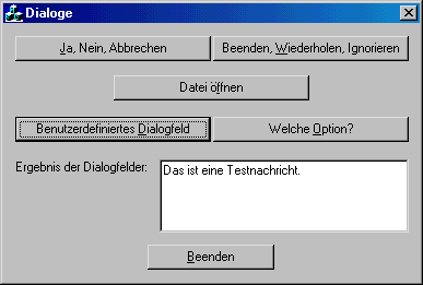 Schließlich haben Sie erfahren, wie man eigene Dialogfelder entwirft und sie in eine Anwendung einbaut, um Informationen vom Benutzer einzuholen und diese Informationen in der Anwendung auszuwerten.