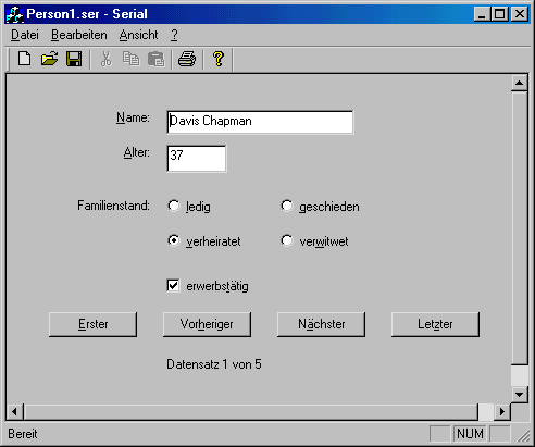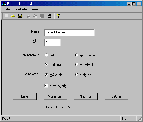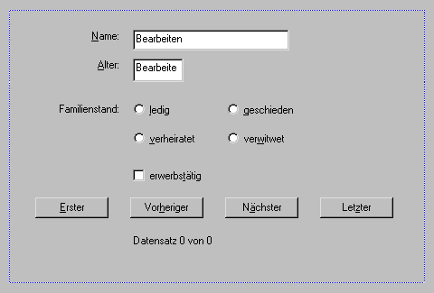 Jetzt können Sie mit Ihrer Anwendung Gruppen von Datensätzen hinzufügen, bearbeiten, speichern und wiederherstellen. Wenn Sie die Anwendung kompilieren und ausführen, können Sie Datensätze für sich selbst, für alle Ihre Familienangehörigen, Ihre Freunde oder jeden, den Sie in diese Anwendung aufnehmen möchten, anlegen. Wenn Sie den erstellten Recordset speichern und erneut öffnen, sobald Sie das nächste Mal mit der Anwendung arbeiten, sollten die Datensätze in genau dem gleichen Zustand wiederhergestellt sein, wie Sie sie eingegeben haben (siehe Abbildung 13.4).