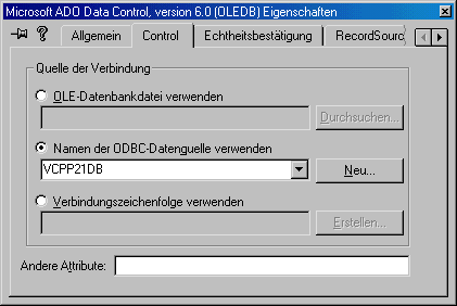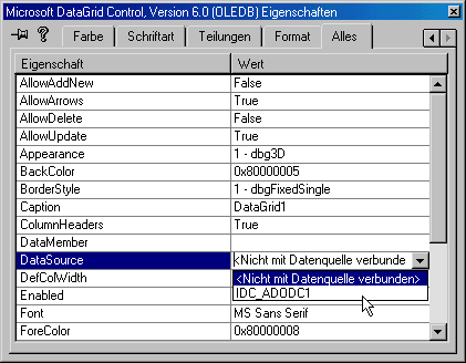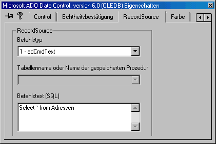 Nachdem Sie das ADO-Steuerelement in Ihr Projekt eingebunden und in einem Fenster plaziert haben, müssen Sie die Datenverbindung in den Steuerelementeigenschaften festlegen, wie es Abbildung 15.2 zeigt. Außerdem ist die Quelle für die Datensätze anzugeben, die das Steuerelement abruft (siehe Abbildung 15.3).