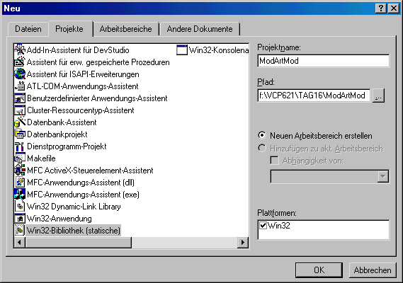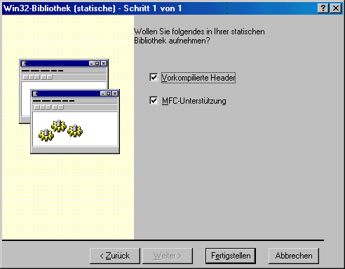 Um das Projekt eines Bibliotheksmoduls zu erstellen, wählen Sie auf der Registerkarte Projekte des Dialogfelds Neu den Eintrag Win32-Bibliothek (statische), wie es Abbildung 16.1 zeigt. Damit teilen Sie Visual C++ mit, daß das Kompilat des Projekts ein Bibliotheksmodul und keine ausführbare Anwendung ist. Von da an brauchen Sie nur noch die Klassen zu definieren und den Code hinzuzufügen. Im einzigen Dialogfeld des Projektassistenten haben Sie die Wahl, Unterstützung für MFC einzubinden und vorkompilierte Header in Ihrem Projekt zu verwenden (siehe Abbildung 16.2).