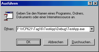 Nachdem Sie alle erforderlichen Änderungen am Bibliotheksmodul vorgenommen haben, kompilieren Sie das Modul, um es für den Einsatz in der Testanwendung vorzubereiten. Wenn Sie die Testanwendung über den Befehl Start / Ausführen der Taskleiste starten (siehe Abbildung 16.6), ist noch kein Unterschied im Verhalten der Anwendung festzustellen, weil Sie Anwendung noch nicht auf den neuesten Stand gebracht haben. Die Anwendung greift immer noch auf die alte Version des Bibliotheksmoduls zurück. Um die neue Version in die Anwendung einzubauen, öffnen Sie das Projekt der Testanwendung in Visual C++. Erstellen Sie das Projekt neu. Dabei passiert nichts weiter, als ein erneutes Linken des Projekts. Führen Sie dann die Anwendung aus. Jetzt ist ein deutlicher Unterschied bei den Zeichnungen zu bemerken, die Ihre Anwendung generiert (siehe Abbildung 16.7).