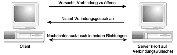 Die meisten Anwendungen, die über ein Netzwerk kommunizieren, ob es sich nun um das Internet oder ein kleines lokales Netzwerk handelt, arbeiten nach den gleichen Prinzipien und bauen auf der gleichen Funktionalität auf, um die Datenübertragung zu realisieren. Eine Anwendung wartet auf dem einen Computer darauf, daß eine andere Anwendung eine Verbindung öffnet. Die erste Anwendung »horcht« auf diese Verbindungsanforderung, genau wie man auf das Klingeln des Telefons hört, wenn man einen Anruf erwartet.
