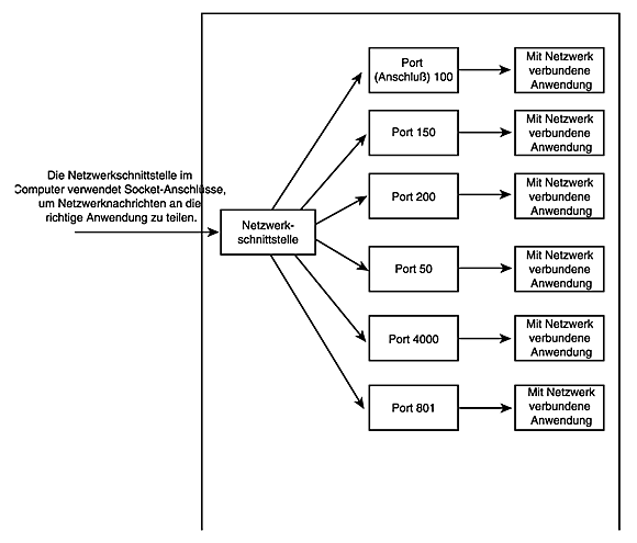 Um eine Socket-Verbindung zu einer anderen Anwendung herzustellen, sind andere Informationen erforderlich als beim Öffnen einer Datei. Wenn man eine Datei öffnen möchte, muß man den Dateinamen und den Standort der Datei kennen. Bei einer Socket-Verbindung muß man wissen, auf welchem Computer die andere Anwendung läuft und über welchen Anschluß die Anwendung hört. Ein Anschluß entspricht etwa einem Telefonanschluß, während die Computeradresse mit der Telefonnummer vergleichbar ist. In gleicher Weise werden Anschlüsse benutzt, um Netzwerkübertragungen weiterzuleiten (siehe Abbildung 20.2). Wie für eine Telefonnummer gibt es auch Mittel, um die Anschlußnummer zu ermitteln, wenn man sie nicht bereits kennt. Das erfordert aber, daß der Computer mit den Angaben konfiguriert ist, über welchen Anschluß die verbindende Anwendung hört. Wenn man die falsche Computeradresse - oder Anschlußnummer - spezifiziert, erhält man gegebenenfalls eine Verbindung zu einer anderen Anwendung. Das entspricht dem vom Telefon bekannten »falsch verbunden«. Vielleicht erhalten Sie aber auch überhaupt keine Antwort, wenn es am anderen Ende der Leitung keine Anwendung gibt, die hört.