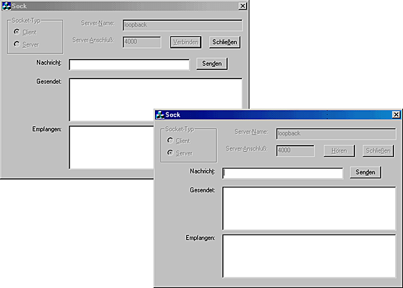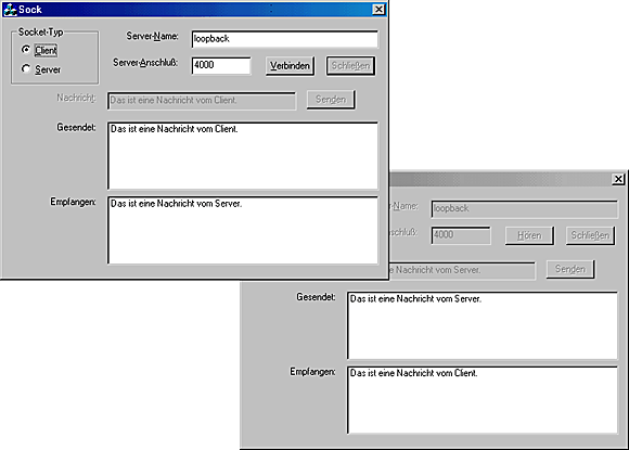 Wenn Sie die Anwendung kompilieren und ausführen, können Sie die Client-Anwendung mit dem Server verbinden, Nachrichten in beiden Richtungen austauschen und die Verbindung des Clients trennen, indem Sie auf die Schaltfläche Schließen klicken. In beiden Anwendungen werden die Steuerelemente zum Senden von Nachrichten deaktiviert, wie es Abbildung 20.8 zeigt. Eine erneute Verbindung des Clients mit dem Server ist möglich, indem Sie wieder auf die Schaltfläche Verbinden klicken und dann weitere Nachrichten zwischen den beiden austauschen, so als ob sie noch gar nicht verbunden gewesen wären. Wenn Sie eine dritte Kopie der Anwendung starten, deren Anschlußnummer ändern, sie als Server bekanntmachen und in den Hörermodus setzen, können Sie Ihren Client abwechselnd mit beiden Servern verbinden. Dazu schließen Sie die eine Verbindung, ändern die Anschlußnummer und stellen dann die Verbindung zum anderen Server her.