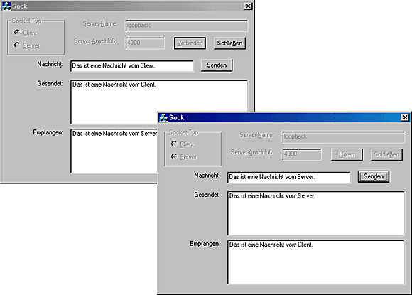 Jetzt sollten Sie die Anwendung kompilieren und zwei Kopien ausführen können, wobei Sie die beiden Anwendungen - wie bereits weiter oben geschehen - miteinander verbinden. Nachdem Sie die Verbindung eingerichtet haben, können Sie eine Nachricht in die eine Anwendung eingeben und sie an die andere Anwendung schicken, wie es Abbildung 20.7 verdeutlicht.