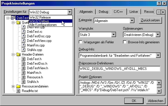 Sobald Sie ein neues Projekt anlegen, stehen sowohl die Release- als auch die Debug- Konfiguration zur Verfügung. Die beiden Modi erzeugen unterschiedlichen Objektcode. In der Konfiguration für den Debug-Modus entsteht ein großes und relativ langsames ausführbares Programm. Das hängt damit zusammen, daß eine Unmenge von Debugging-Informationen in das Programm eingebunden werden und alle Optimierungen des Compilers deaktiviert sind.