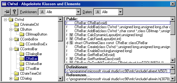Die Ansicht der abgeleiteten Klassen und Elemente des Quellcode-Browsers zeigt Klassen, die von CWnd abgeleitet sind.