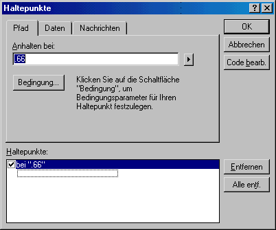 Haltepunkte schaltet man ein oder aus, indem man auf das Symbol Haltepunkt (mit dem Bild einer Hand) klickt. Haltepunkte lassen sich auch über das Dialogfeld Haltepunkte entfernen. Dafür stehen die Schaltflächen Entfernen und Alle entf.(ernen) zur Verfügung. Haltepunkte kann man auch beibehalten, aber deaktivieren. Dazu schaltet man im Dialogfeld Haltepunkte das Kontrollkästchen neben dem im Listenfeld aufgeführten Haltepunkt aus. Ein erneutes Klicken auf das Kontrollkästchen schaltet es ein und aktiviert den Haltepunkt wieder.
