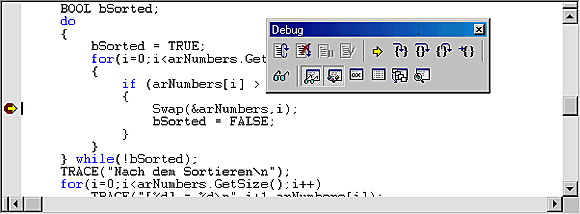 Eines der nützlichsten Features der Debugging-Umgebung von Visual C++ ist der interaktive Einzelschrittbetrieb. Damit läßt sich der Code zeilenweise ausführen und der Inhalt der Variablen untersuchen. Außerdem kann man Haltepunkte setzen, so daß das Programm bis zu diesem Haltepunkt läuft und dort stoppt. Von hier aus kann man im Einzelschrittbetrieb arbeiten, bis man das Programm normal fortsetzen möchte.