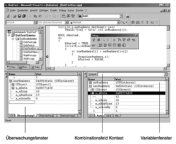 Ein Großteil der Probleme läßt sich wahrscheinlich am effektivsten mit den Debugging-Werkzeugen für den Einzelschrittbetrieb und das Setzen von Haltepunkten lösen. Die Unterstützung für verschiedene Typen von Haltepunkten und die verfügbaren Informationen im Einzelschrittbetrieb sind in Visual C++ sehr ausgeklügelt. Hier können wir nur eine Vorstellung davon vermitteln, wie leistungsfähig dieses Werkzeug zur Fehlersuche ist.