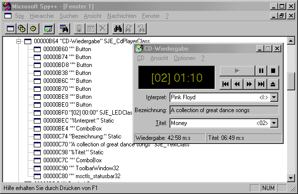 Das Fenster von Spy++ mit dem Abschnitt CD-Wiedergabe des Windows-Desktop.