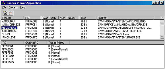 Prozeßanzeige zeigt MSDEV.EXE und dessen Threads.