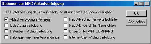 Es lassen sich Windows-Nachrichten, Datenbanknachrichten, OLE-Nachrichten und viele andere Stufen der Ablaufverfolgung hinzufügen, um ausgewählten Problemen auf die Spur zu kommen. Diese Nachrichten werden dann durch den MFC-Code für die verschiedenen ausgewählten Flags generiert.